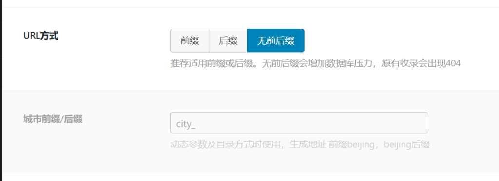 前后綴模式下,支持自定義,比如 前綴模式填寫(xiě) city_ 時(shí)會(huì)生成 http://m.fs213.com/city_beijing/ ,后綴模式填寫(xiě) _city 時(shí)會(huì)生成 http://m.fs213.com/beijing_city/,無(wú)前后綴模式時(shí) 生成 http://m.fs213.com/beijing/,三種模式自由切換,無(wú)前后綴模式時(shí),前后綴設(shè)置無(wú)效。