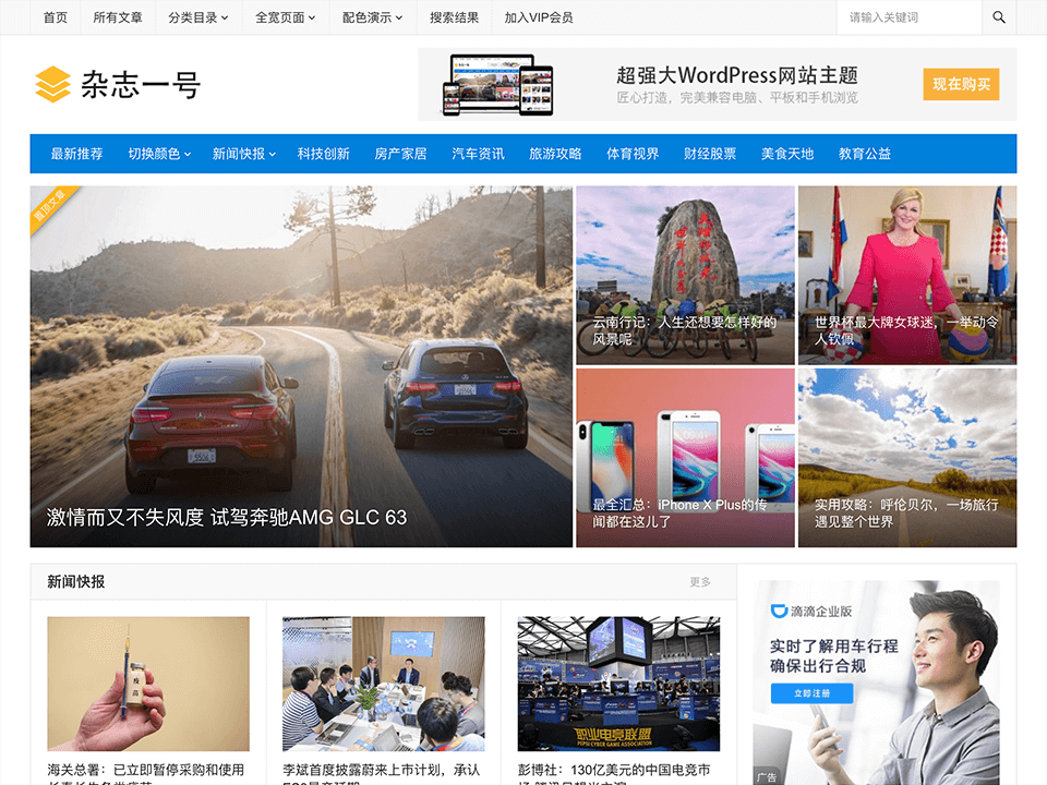 “雜志一號(hào)”是一款由主題巴巴團(tuán)隊(duì)原創(chuàng)設(shè)計(jì)開發(fā)的WordPress新聞資訊主題,這款主題采用全新的自適應(yīng)設(shè)計(jì)布局,首頁可添加多個(gè)內(nèi)容欄目模塊和廣告位。通過后臺(tái)的主題設(shè)置面板,你可以輕松自定義各種主題選項(xiàng)。如果你正希望搭建一個(gè)漂亮、好用、專業(yè)的新聞資訊網(wǎng)站、在線雜志或自媒體網(wǎng)站,那么這款“雜志一號(hào)”WordPress主題將會(huì)很好地完成你賦予它的使命與期待。