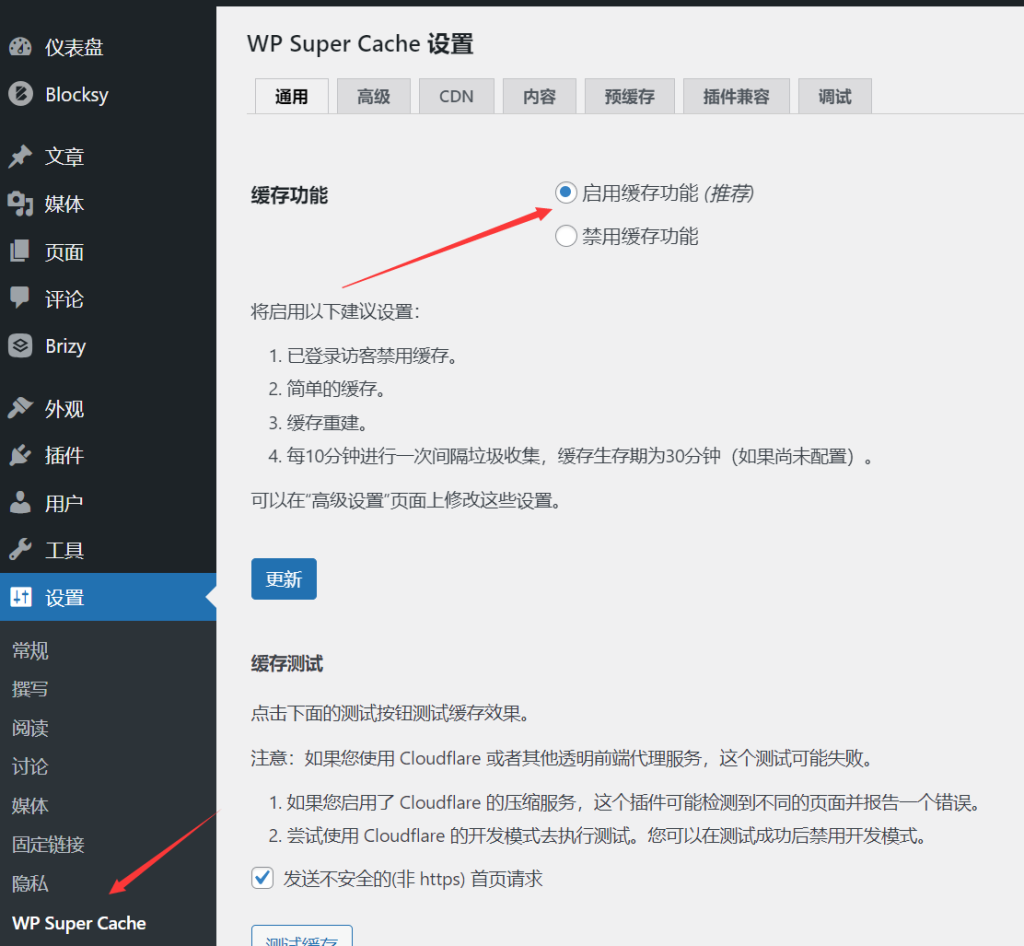 2、啟用后在設(shè)置菜單中,點(diǎn)擊 WP Super Cache ,在頁(yè)面中勾選 啟用緩存功能,更新就可以了,其它的都可以不用設(shè)置,簡(jiǎn)單方便。