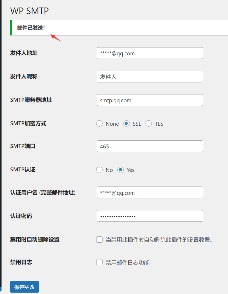 上面填寫完成后,點擊保存更改,如果填寫有誤時,保存會比較慢,有錯誤提示,保存完成和可測試郵件試試。