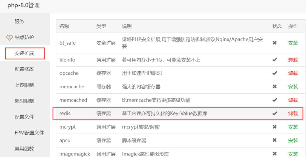 Redis 安裝,已寶塔面板為例,在PHP管理中 安裝 redis 擴展,安裝完成后,在插件中安裝 Redis Object Cache