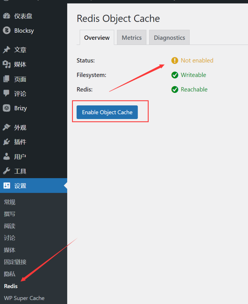插件安裝完成后會顯示 Not enabled,說明沒有啟用,點擊下面的 Enable Object Cache