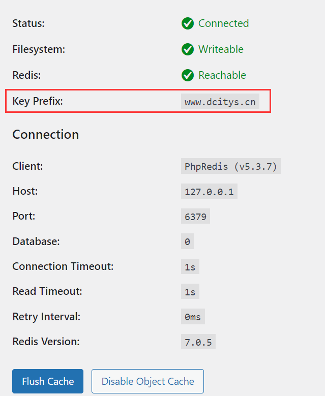 如果能顯示下面的樣子說明啟用成功,注意顯示的時候是不包括紅框內(nèi)內(nèi)容,如果服務(wù)上有多個WP網(wǎng)站,而且都需要安裝 Redis Object Cache,需要在 wp-config.php 添加 Key Prefix 配置項,來區(qū)分網(wǎng)站緩存,避免數(shù)據(jù)沖突,