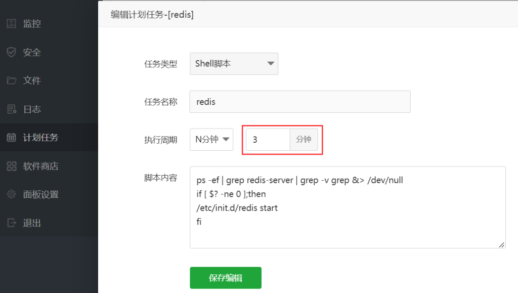 但我們不知道什么時候 Redis 服務(wù)會掛掉,也不能隨時進行啟動Redis服務(wù),所以我們要建立一個Redis 進程守護的計劃任務(wù),如果系統(tǒng)檢測到Redis 意外停止,自動啟動一下就可以了,寶塔計劃任務(wù)設(shè)置如下,執(zhí)行周期根據(jù)自己自行設(shè)置。