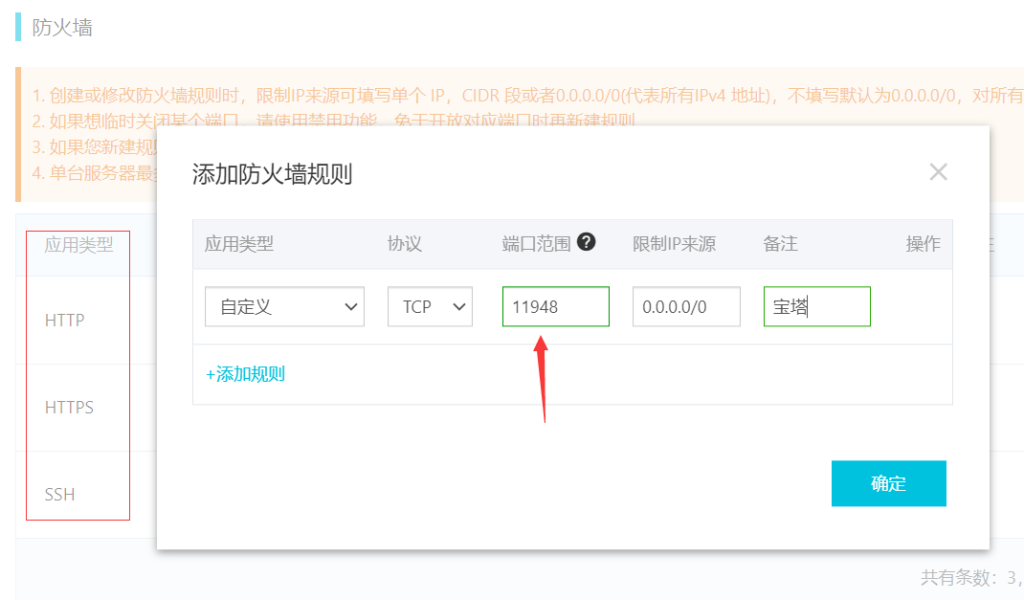 其中登錄地址中冒號后面為端口號11948,端口號為隨機產(chǎn)生,每次都不同,需要將此端口添加到輕量應(yīng)用服務(wù)器的防火墻中,防火墻默認開啟的有 http的80端口,https的443端口,和ssh的22端口,如果沒有請?zhí)砑由稀?/p>