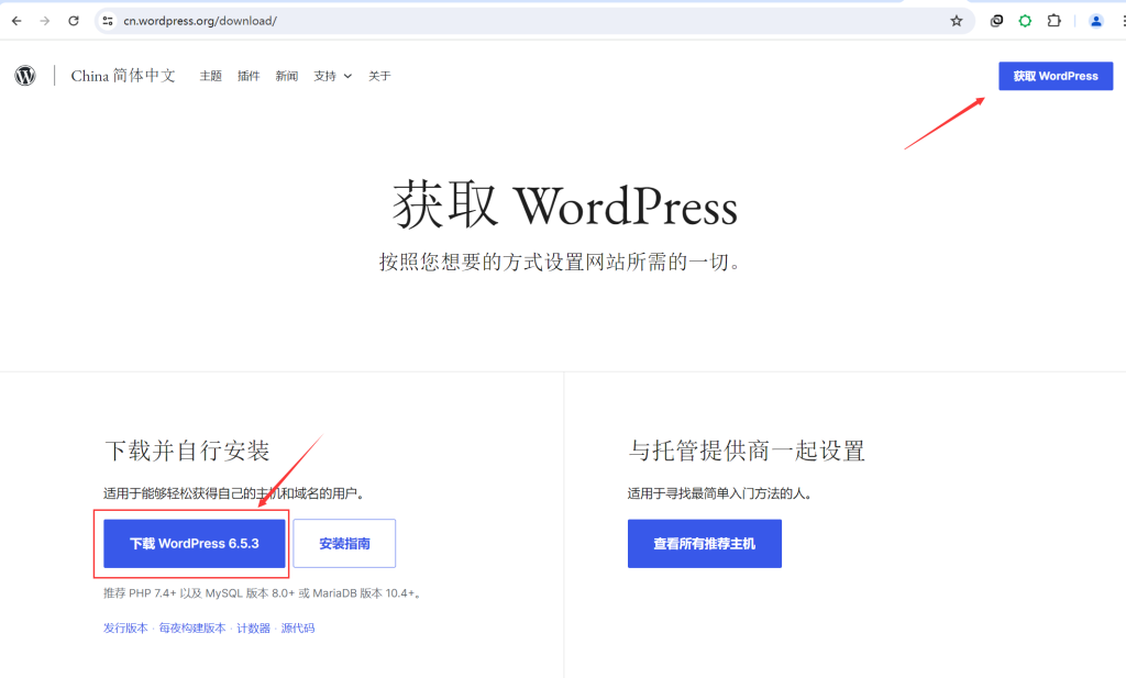 1、WordPress 下載,在 WordPress 中文官網下載,網址 https://cn.wordpress.org/,點擊右上角“獲取WordPress”,然后在頁面中點擊“下載WordPress ***”,注意不要在第三方網站下載,避免源碼被改動。
