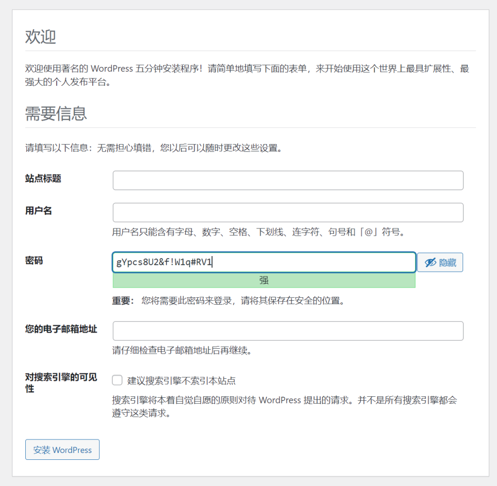 6、設置網站信息,網站標題,用戶名密碼等,注意正常情況下不要勾選“建議搜索引擎不索引本站點”選項,勾選后就不收錄你的網站了。