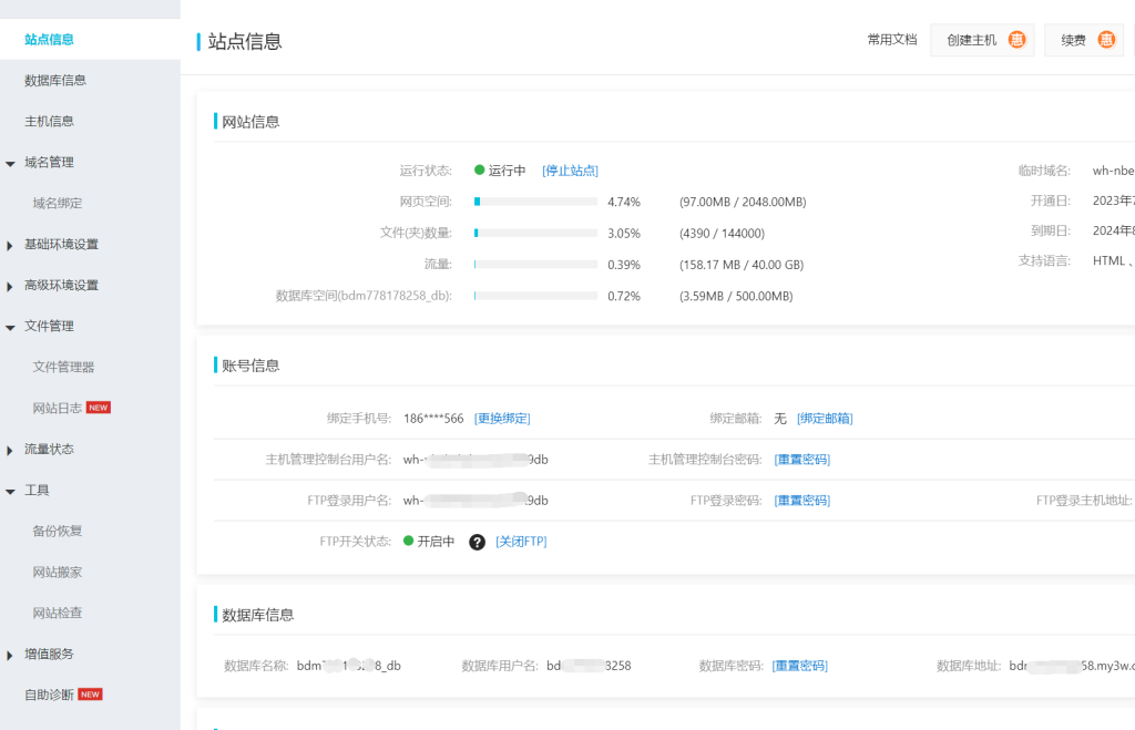 3、虛擬機(jī)購買后可在虛擬機(jī)管理后臺(tái)查看FTP信息及數(shù)據(jù)庫信息,